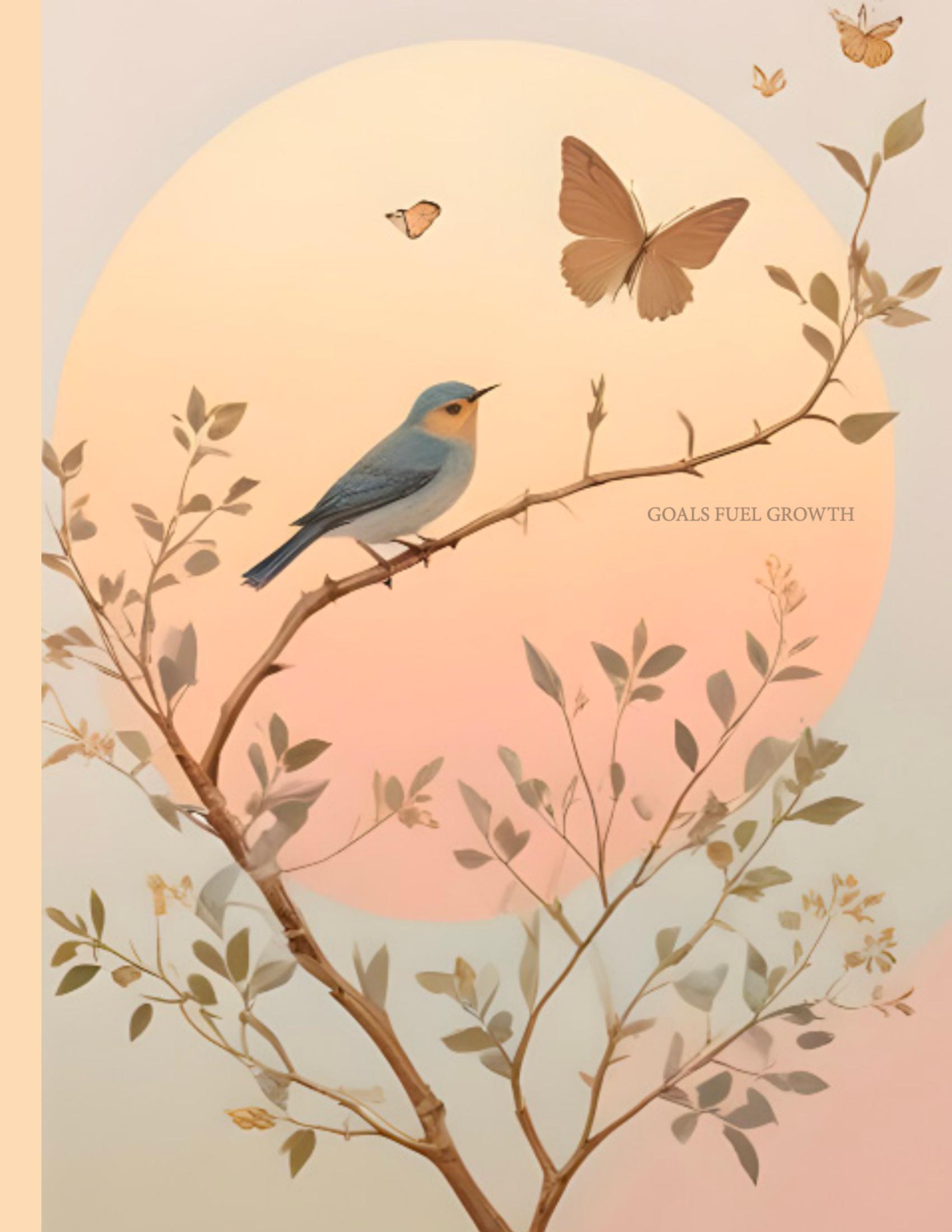 A peaceful bird and butterflies flutter under a pastel sun. Embrace calm ambition and let your goals bloom with purpose.