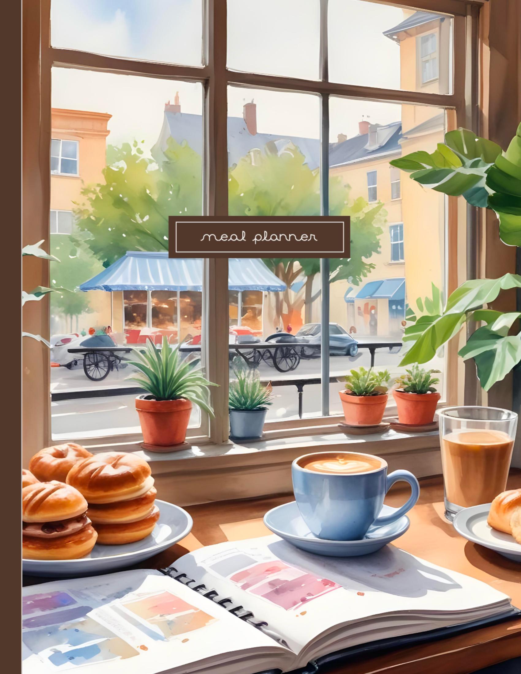 Set in a quaint cafe scene with pastries and coffee, this planner inspires mindful planning and joyful eating.