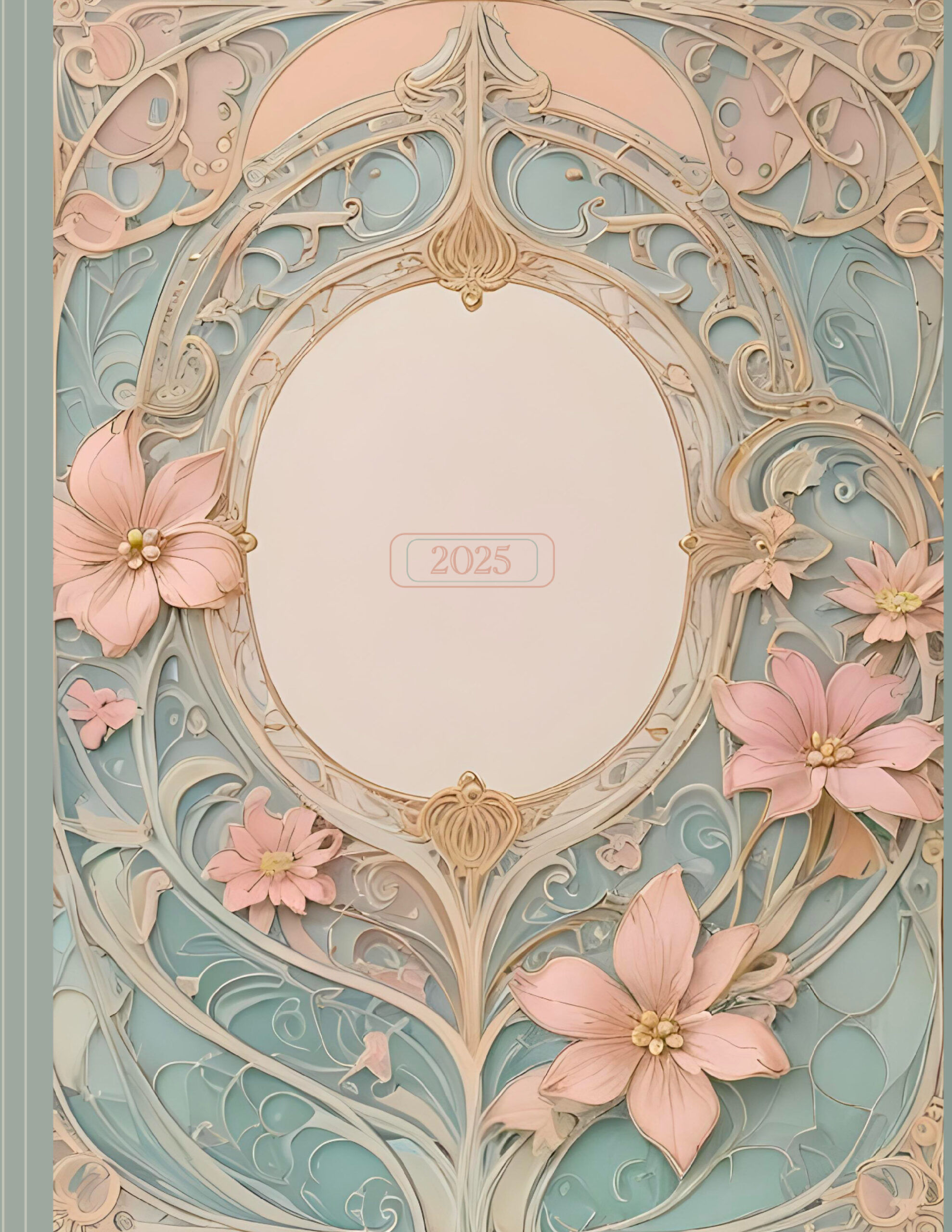 Intricate Art Nouveau design with pink flowers framing an oval, highlighting “2025” in soft pastels.