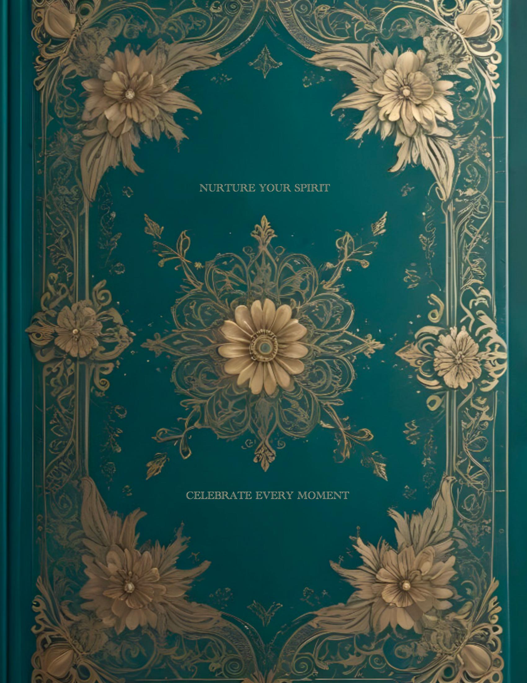 An emerald backdrop with intricate golden florals. Designed for soulful reflections and everyday celebration of progress.