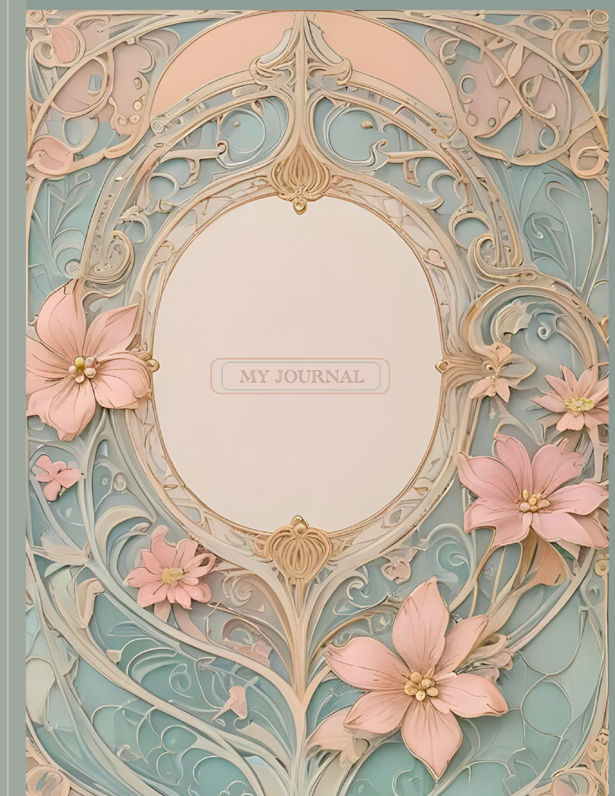 Elegant pastel journal cover adorned with intricate floral patterns, delicate scrollwork, and soft feminine charm.
