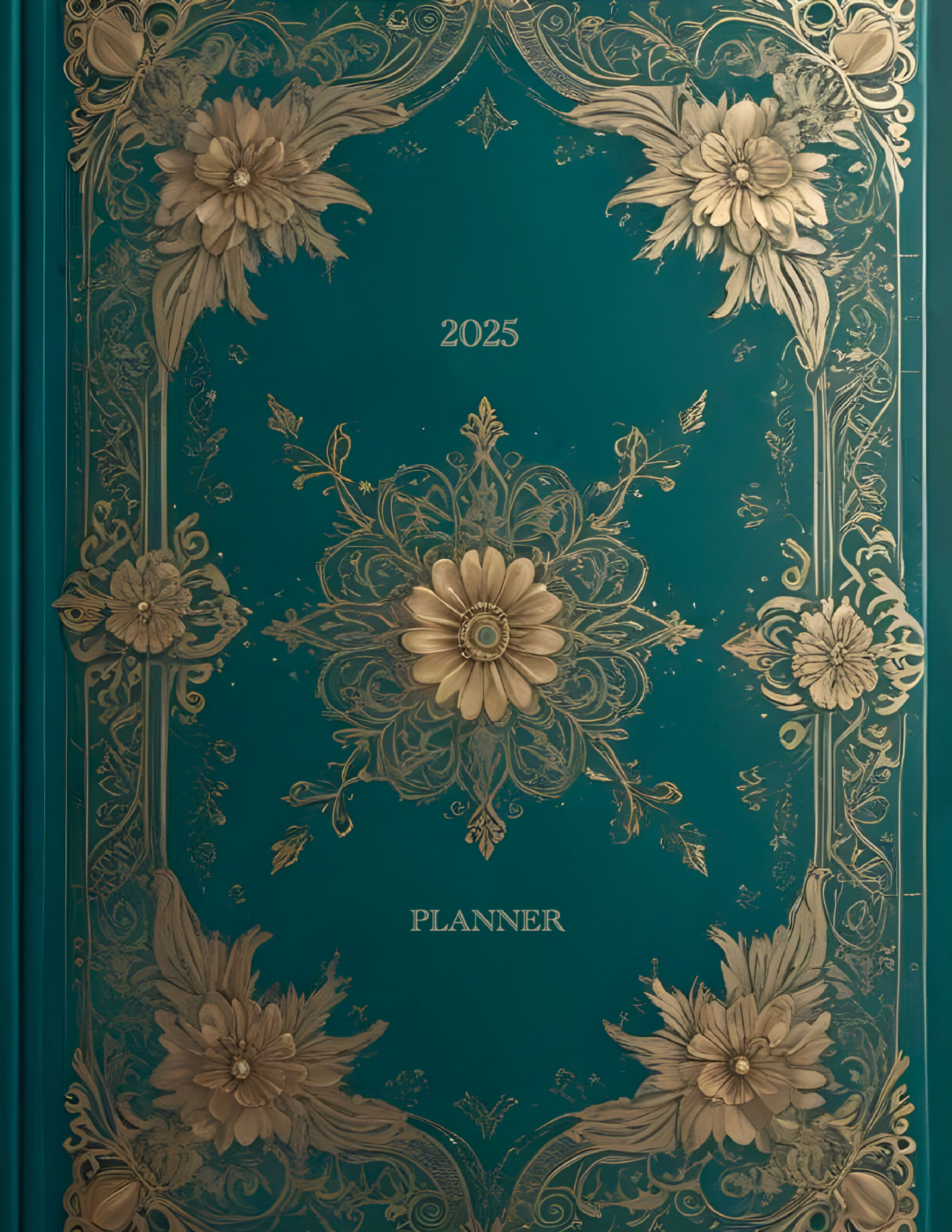 A 2025 planner with intricate gold floral designs on a teal background, exuding vintage charm.