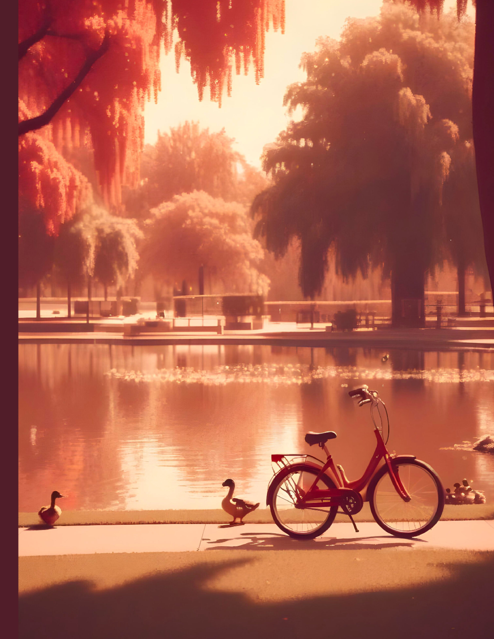 Tranquil waters reflect autumn’s golden hues, as ducks and a bicycle share the peaceful view.