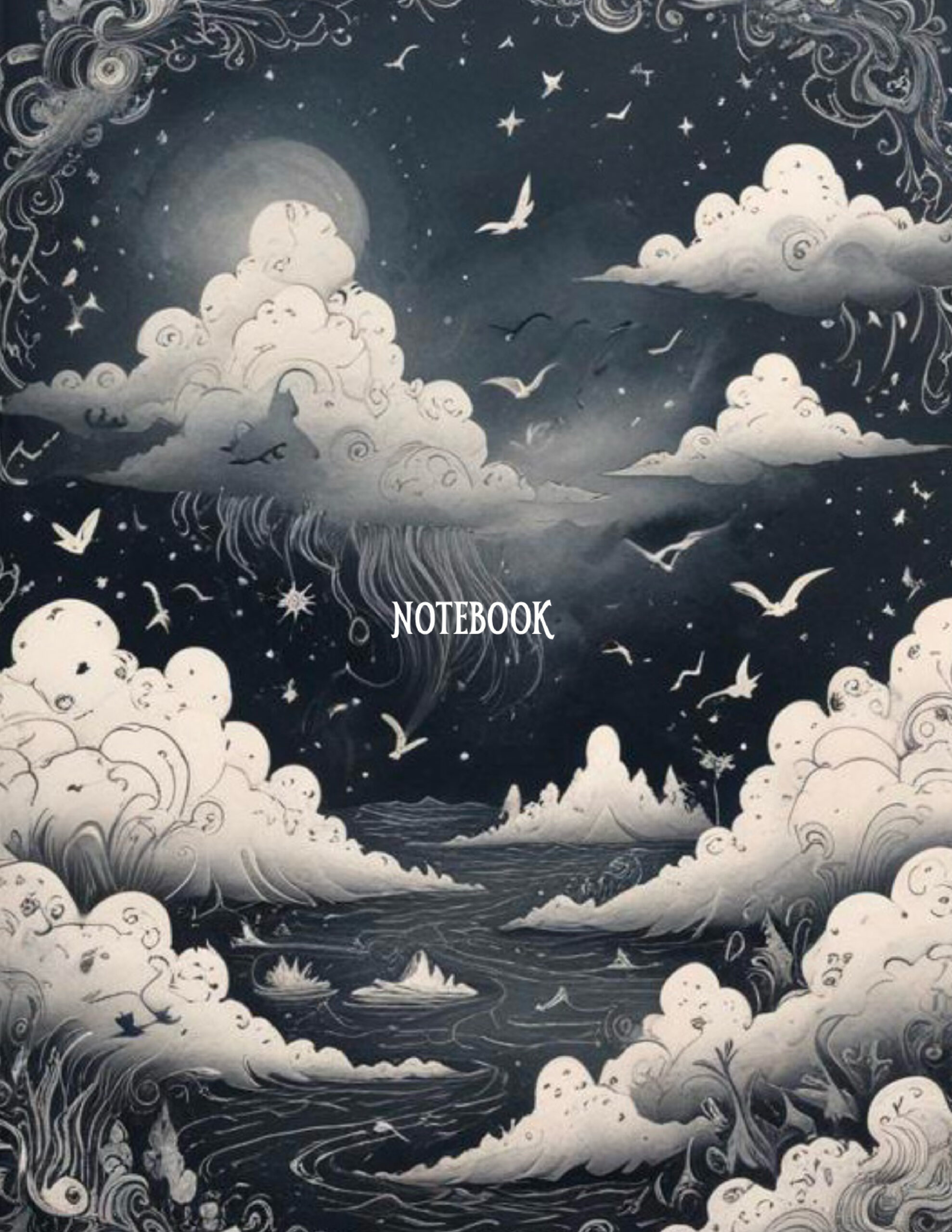 Ethereal clouds drift above starlit waves, cradling dreams in a sea of nighttime serenity.